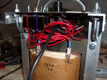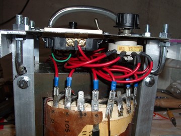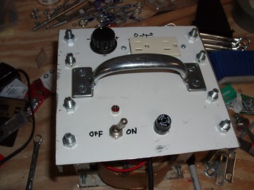 Recently I decided to build a handle onto it. I ended up building a small aluminum frame that bolted to the transformer using its existing bolt holes, and a top panel to which I mounted a power switch, fuse, indicator light, adjustable voltage knob, output outlet, and a handle. I haven't added a skirt to cover up the exposed tranformer terminals, but it's now easier to use and carry.