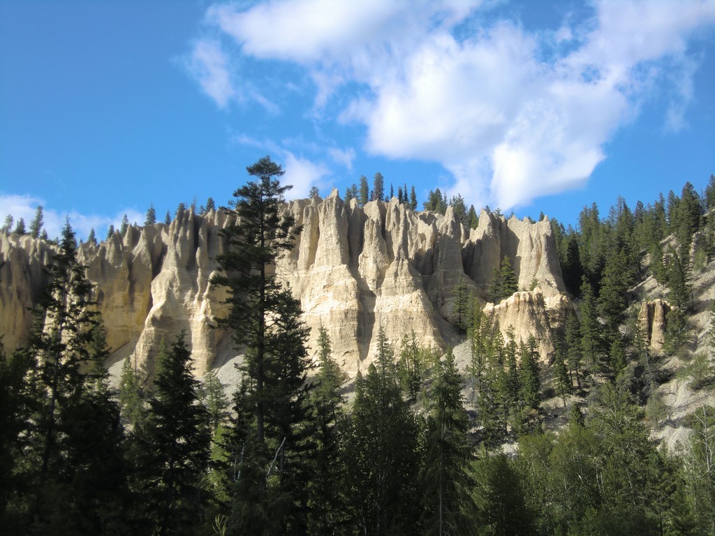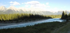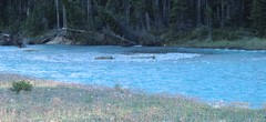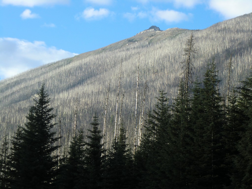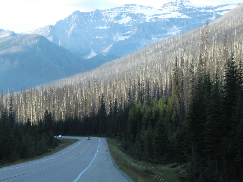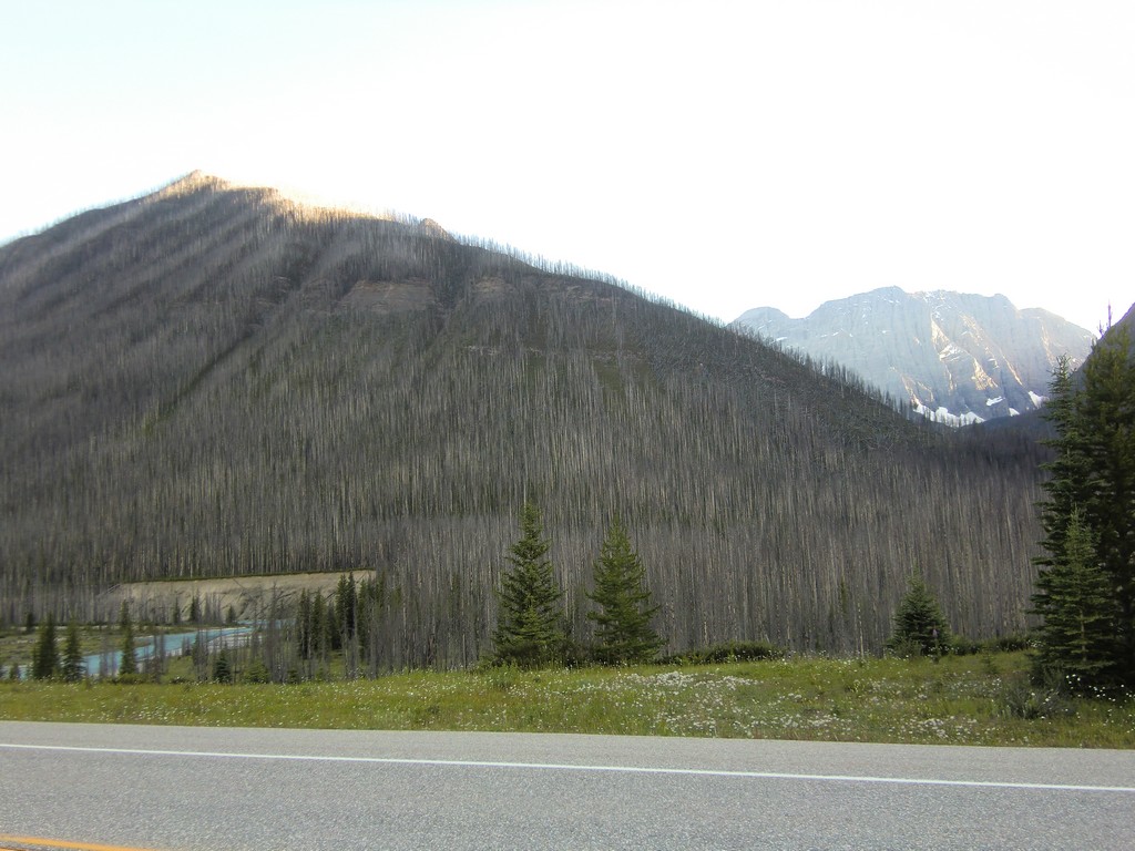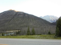 At Radium Hot Springs, BC, highway 93 splits off into Kootenay National Park. The road follows mountain valleys, and the valley floor is open giving a good view of the ice blue river and the road. There were large swaths of what looked like dead trees covering whole mountainsides.