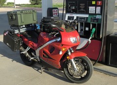 The past few days had been busy, so I didn't finish packing the bike until early in the morning. I had two Pelican 1520 cases mounted on the sides, and a Storm iM2750 case mounted on the rear. For the tank bag, I had borrowed a very large bag made by River Road. It was actually two bags, one of which zippered to the other. The larger bottom bag zippered to a base which was strapped to the tank and triple tree. Fully loaded, the luggage weighed about 160 lbs. I was carrying a pretty good collection of tools, including wrenches, sockets, hammer, large pry bar, tire iron, compressor, soldering iron, dremel, and other tools I thought might come in handy should I break down.