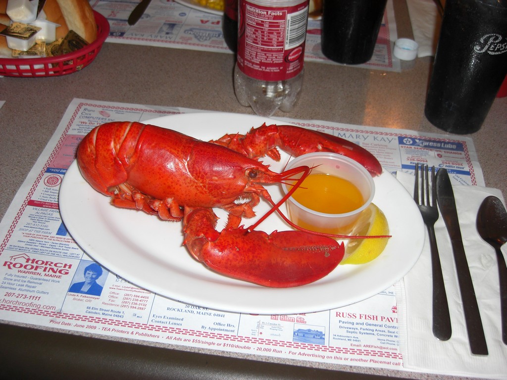 I left Boston via I-95 and Route 1, occasionally switching between the two until around Brunswick, ME, where I got on Route 1 and started my ride along the coast. It was a foggy drizzly day, and while Route 1 was nice, the constant interruptions from passing through towns near I-95 made it less enjoyable. Traffic lessened after I-95 and Route 1 parted ways, and I stopped in for dinner in Rockland. I had been seeing signs advertising lobsters all along the way, so I wanted to get a lobster dinner at least once.
