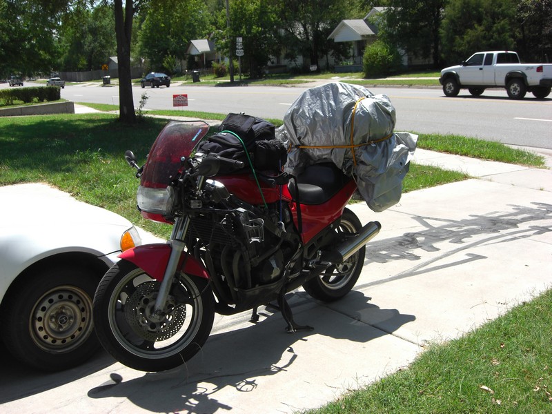 The night before, I started gathering my things and working on getting packed for the trip. Most of my stuff would go in a large duffel bag that would sit on the luggage rack. The bottom was mainly packed with tools: a 3/8" drive socket set, two sets of metric wrenches, needle nose pliers, locking pliers, regular pliers, large crescent wrench, screwdrivers, allen wrenches, a small 12V rotary tool (like a dremel), a torch with a soldering attachment, and a small hammer. Most of the tools were put in ziplock bags to help keep them together and dry. My clothes and towel were packed into grocery bags as well in case the duffel bag got wet. I also had a ziplock bag with a roll of toilet paper and a grocery bag with a roll of paper towels. All my shower supplies were kept in another ziplock bag. A couple lengths of rope, a few ratchet tie-downs, and extra bungees were thrown in for good measure. I brought a can of chain lube and an extra headlight bulb as well (don't want to be caught out riding with a burned out headlight).