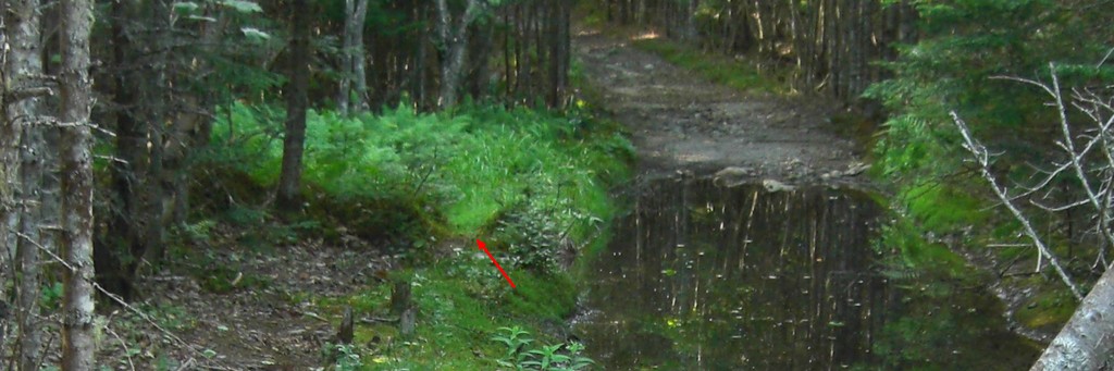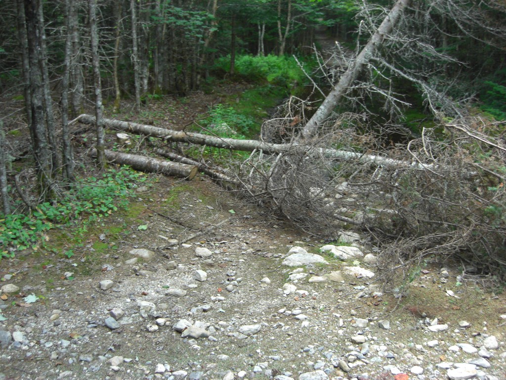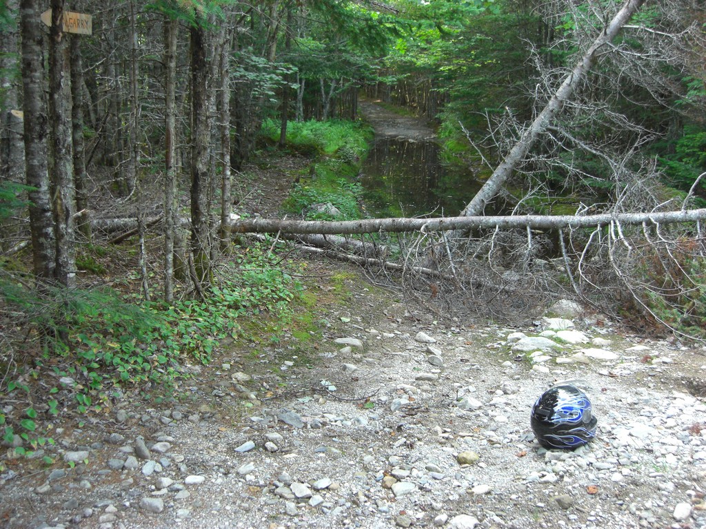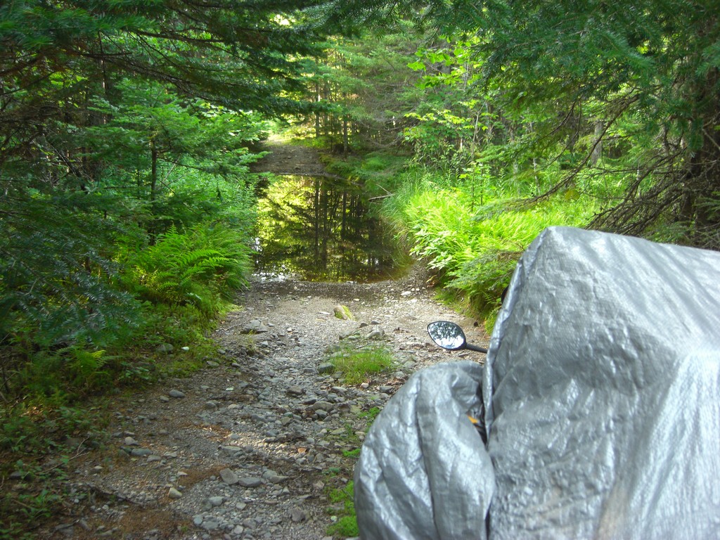 It was blocked by trees, and there was standing water up to a foot deep covering the trail... but there was a small muddy path about a foot wide to one side. Of particular concern was a large hump in the path, followed by a grassy muddy section that ran right next to the standing water. The center was notched in a spot not much wider than a tire.