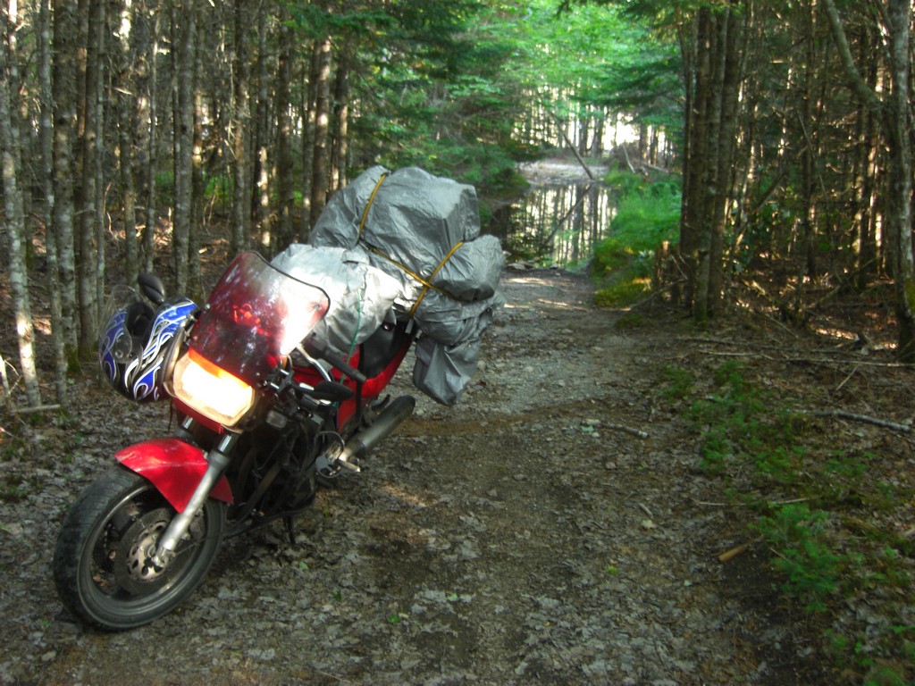 I couldn't see a way around it, and had to turn back. Unfortunately, I didn't do so well on the return trip. I think I chickened out a bit and didn't quite have enough speed. Halfway over the hump, I slowed too much, and had the terrible realization I had made a big mistake as I started going over to the left. With nothing to put my left foot down on, the bike teetered over into the water. I half jumped off so I was only wet below the knees. I immediately started ripping bungee cords off and throwing everything onto the trail before the stanky water soaked in any more.