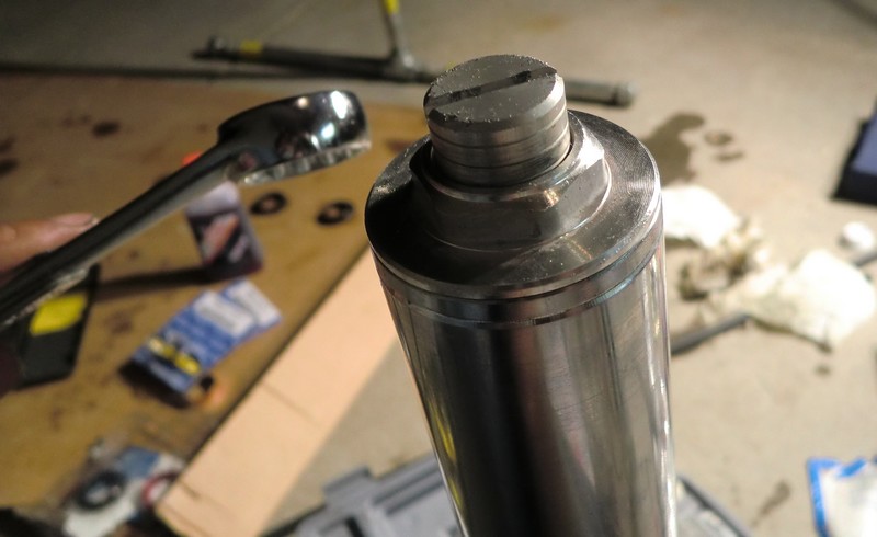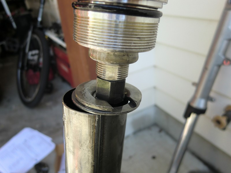Close-up of where the fork spring seats. Notice that the more tightly coiled end of the spring is on this side (the Race Tech springs did not have this asymmetry):