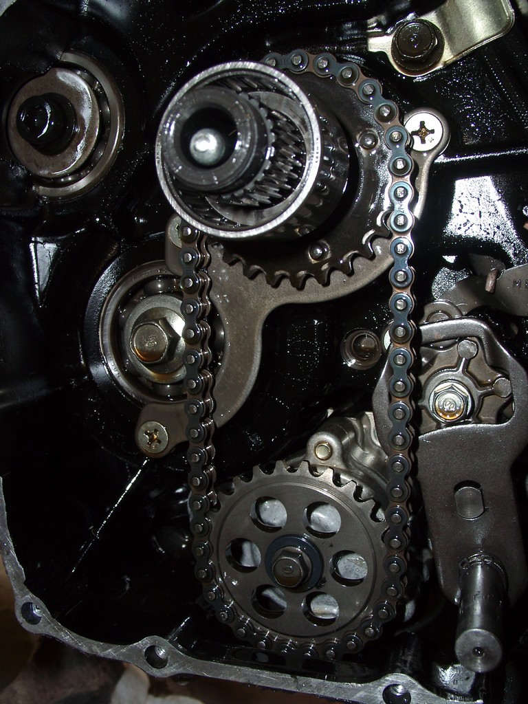 Behind the clutch basket. The oil pump drive sprocket and gear shift spindle plate are visible.