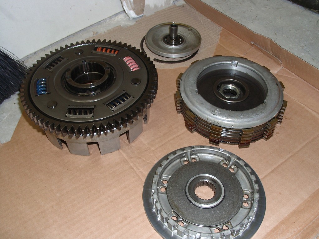 Clutch components removed. Clockwise from upper left, clutch basket, lifter plate, plates and pressure plate, and clutch center.