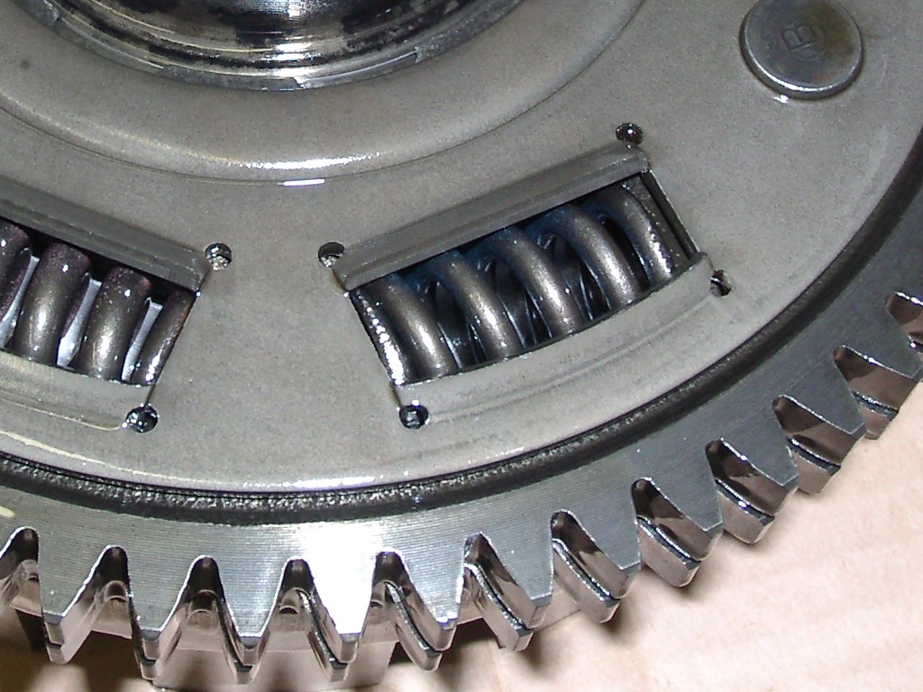 Closeup of the clutch outer gear. The gear is actually composed of two thinner gears which are offset slightly. When one gear is rotated slightly relative to the other, the springs are compressed and the teeth align. I don't know for sure, but I think this allows for a tight fit.