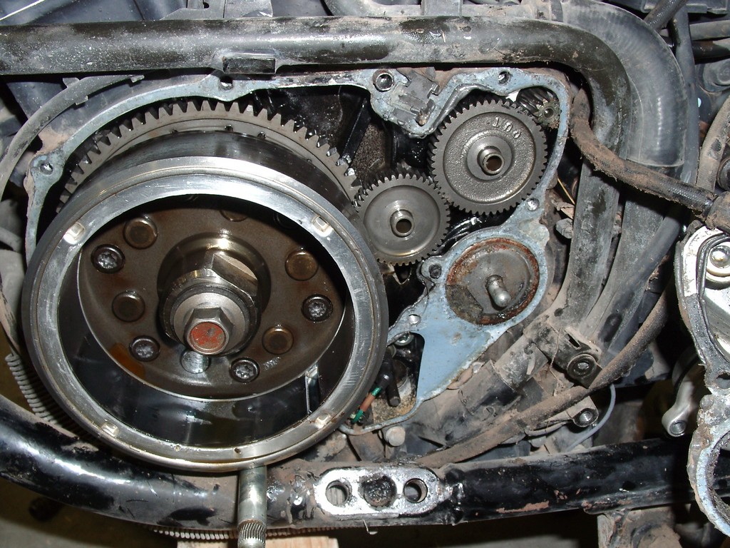 Closeup with the stator cover removed. The starter gear and clutch lifter pushrod are visible. The bike had been rear-ended at some point, and I believe the rider mashed down on both the shifter pedal, which resulted in the spline damage visible at the bottom of the picture.